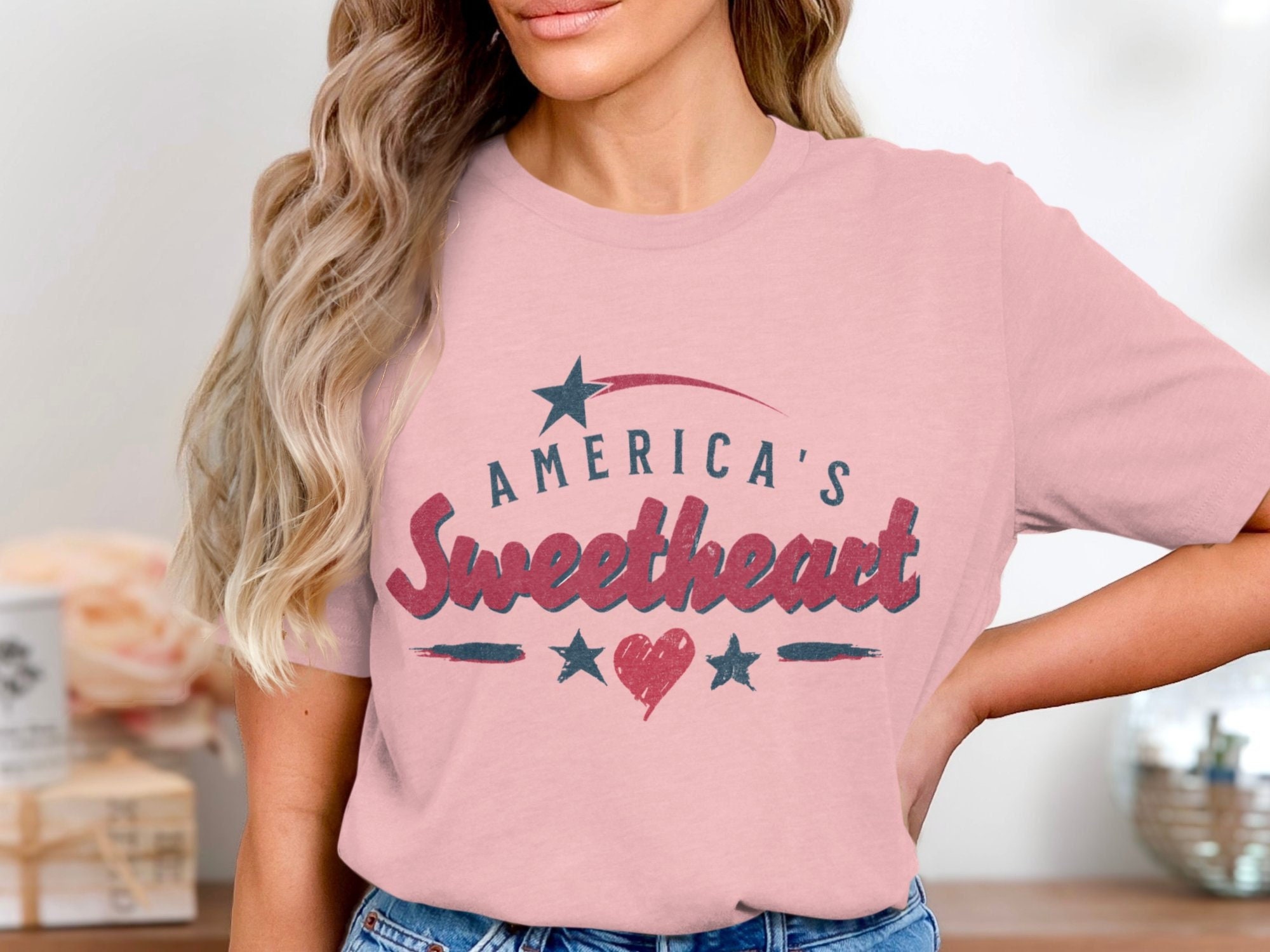 Retro America's Sweetheart T-Shirt, Patriotic Heart Design Tee, Vintage Star Print Shirt, American Pride Fashion, USA Lover Gift