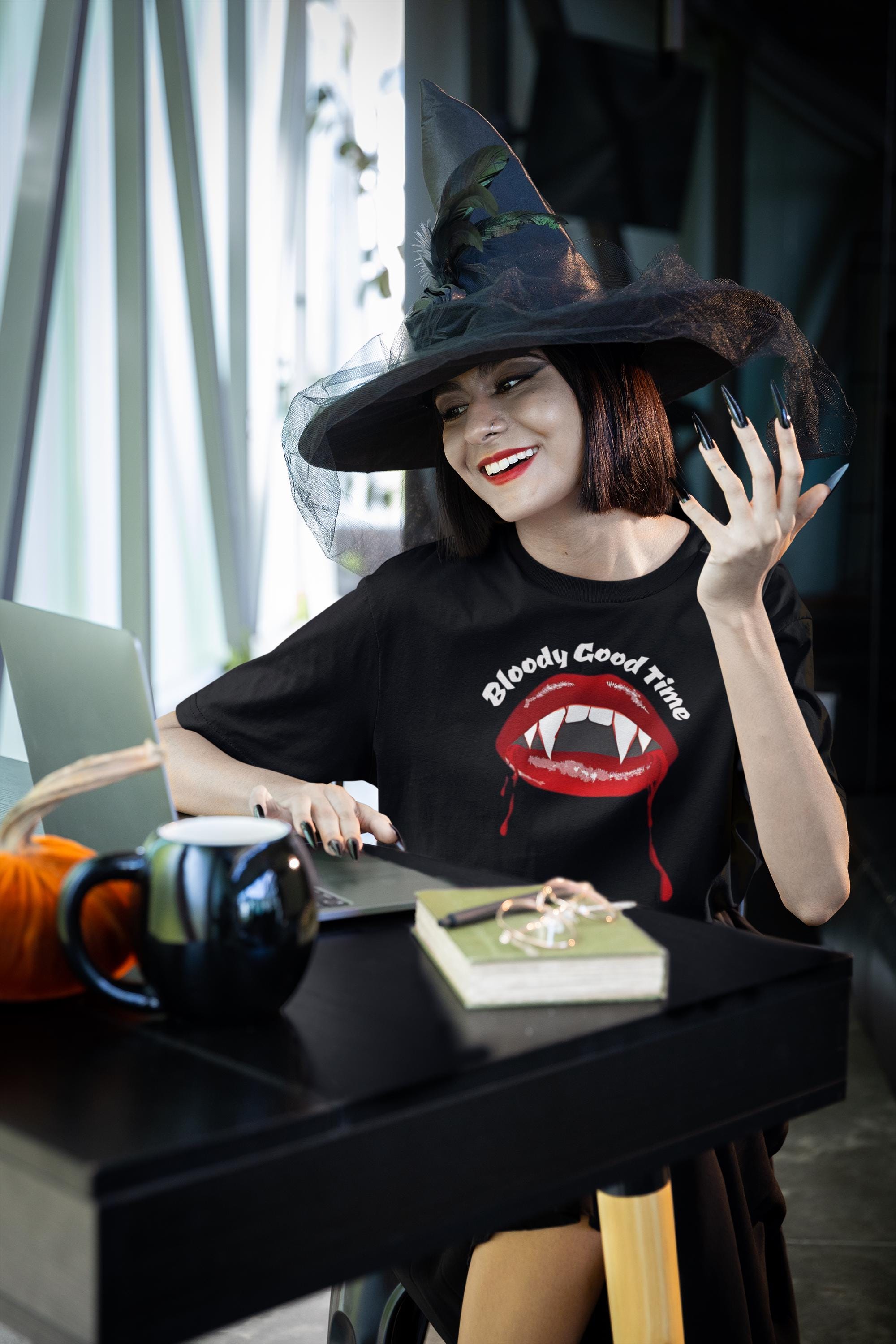Bloody Good Time T-Shirt Vampire lips with Fangs Graphic Tee Spooky Halloween Shirts Cool Gothic Halloween party top Great October Gift